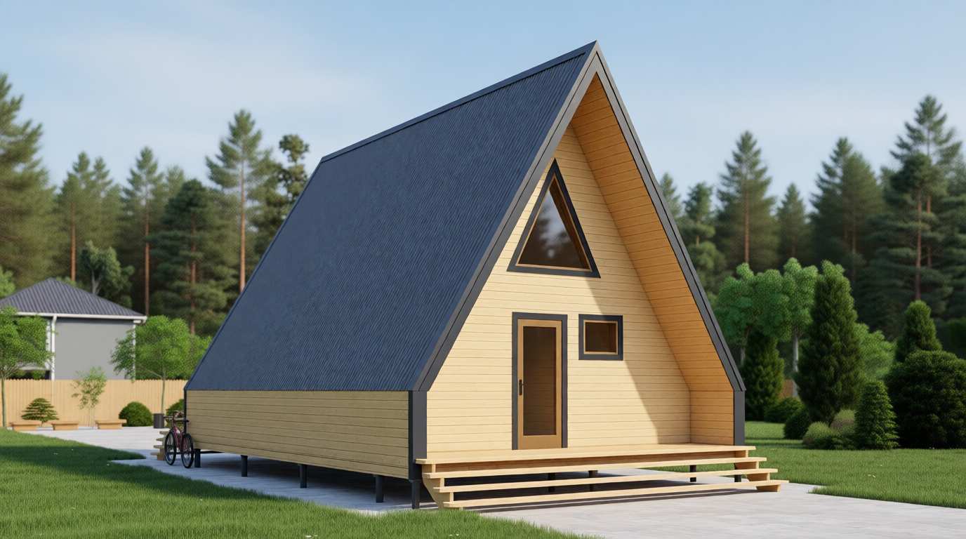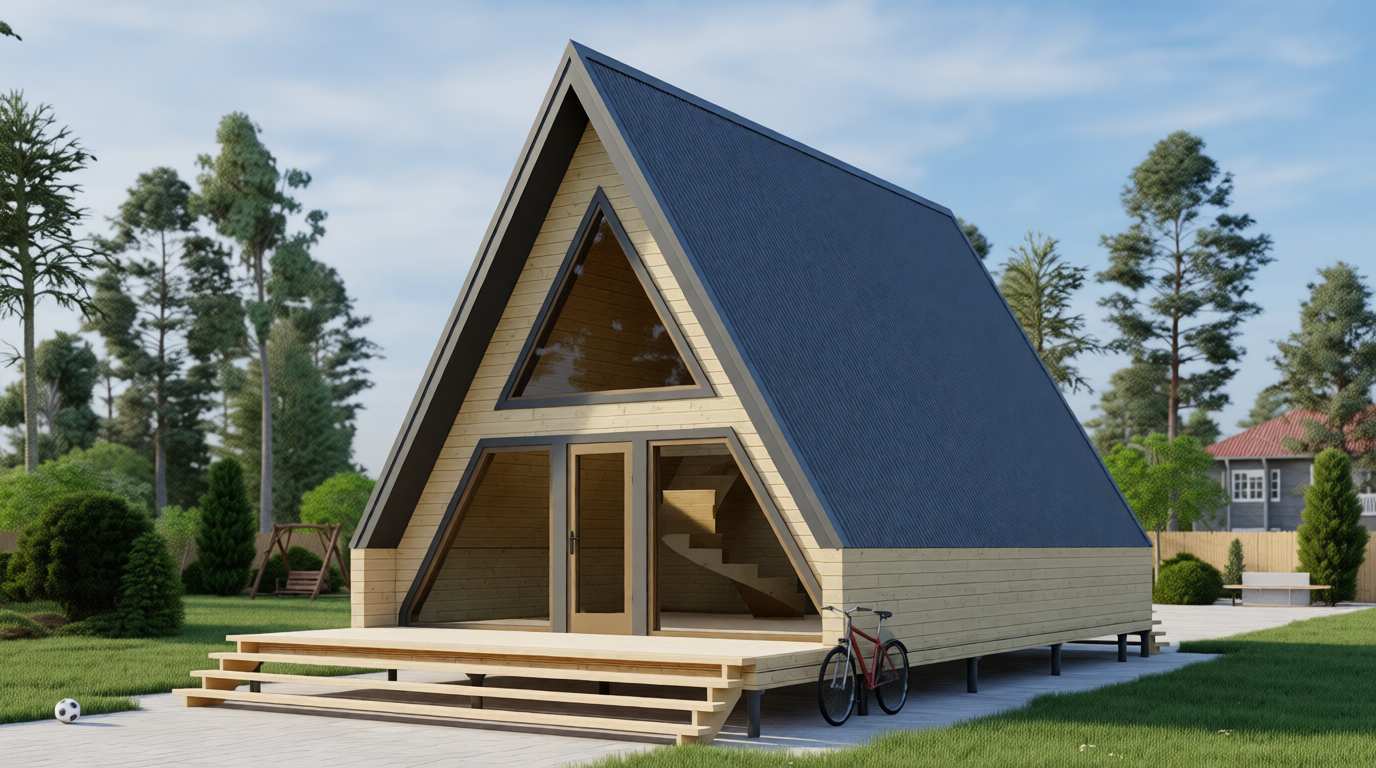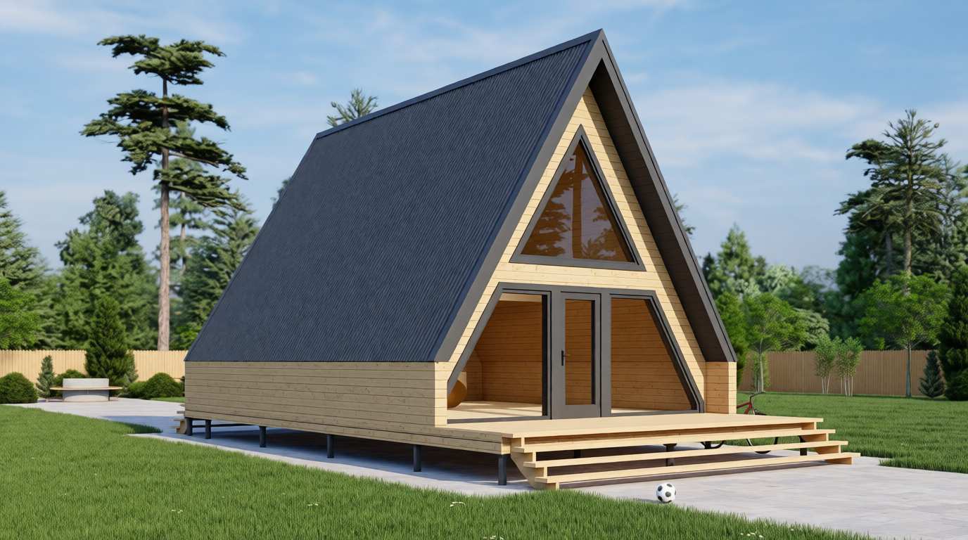 Рекомендуемый фундамент для каркасно-щитового дома A-frame 6х8 по проекту А-4 свайно-винтовой, который уже включен в итоговую стоимость или более долговечные железобетонные сваи. Уже в базовой комплектации дом шалаш по проекту А-4 имеет кровлю из профлиста 0,45 мм.