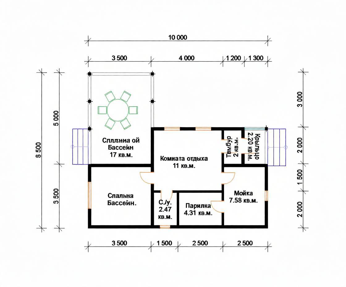 Баня из бруса 8 на 10 с бассейном площадью 60 м2