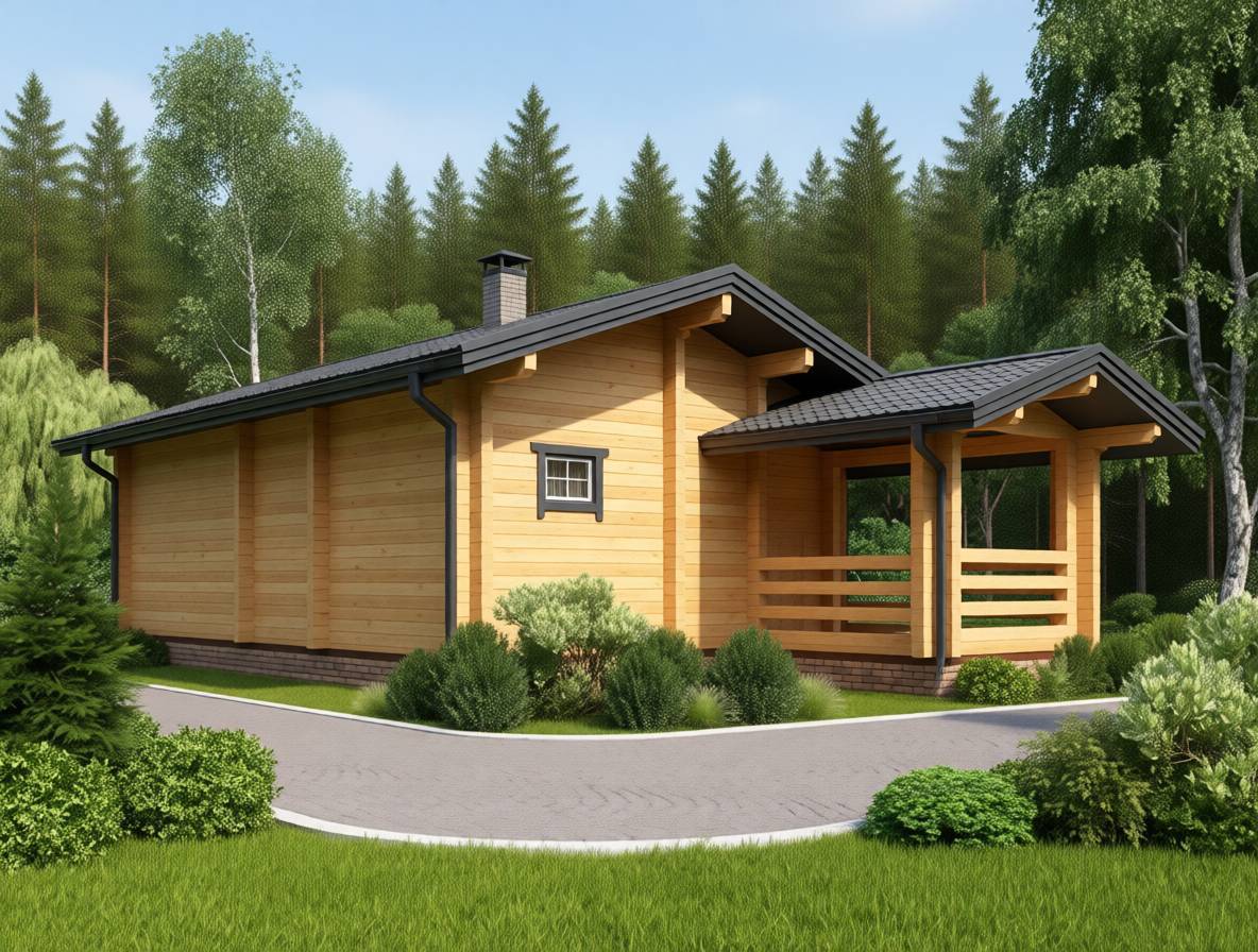 Одноэтажная баня 7 на 10 из бруса с террасой площадью 68 м2