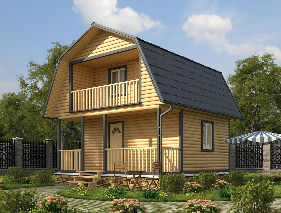 Гостевой дом баня 6 на 6 площадью помещений 41 кв.м и размером сруба 6х6 стоит построить в базовой комплектации за 800000 рублей из пиленого бруса сечением 150 на 150 мм или за 886000 рублей из профилированного бруса 140 на 140 мм.