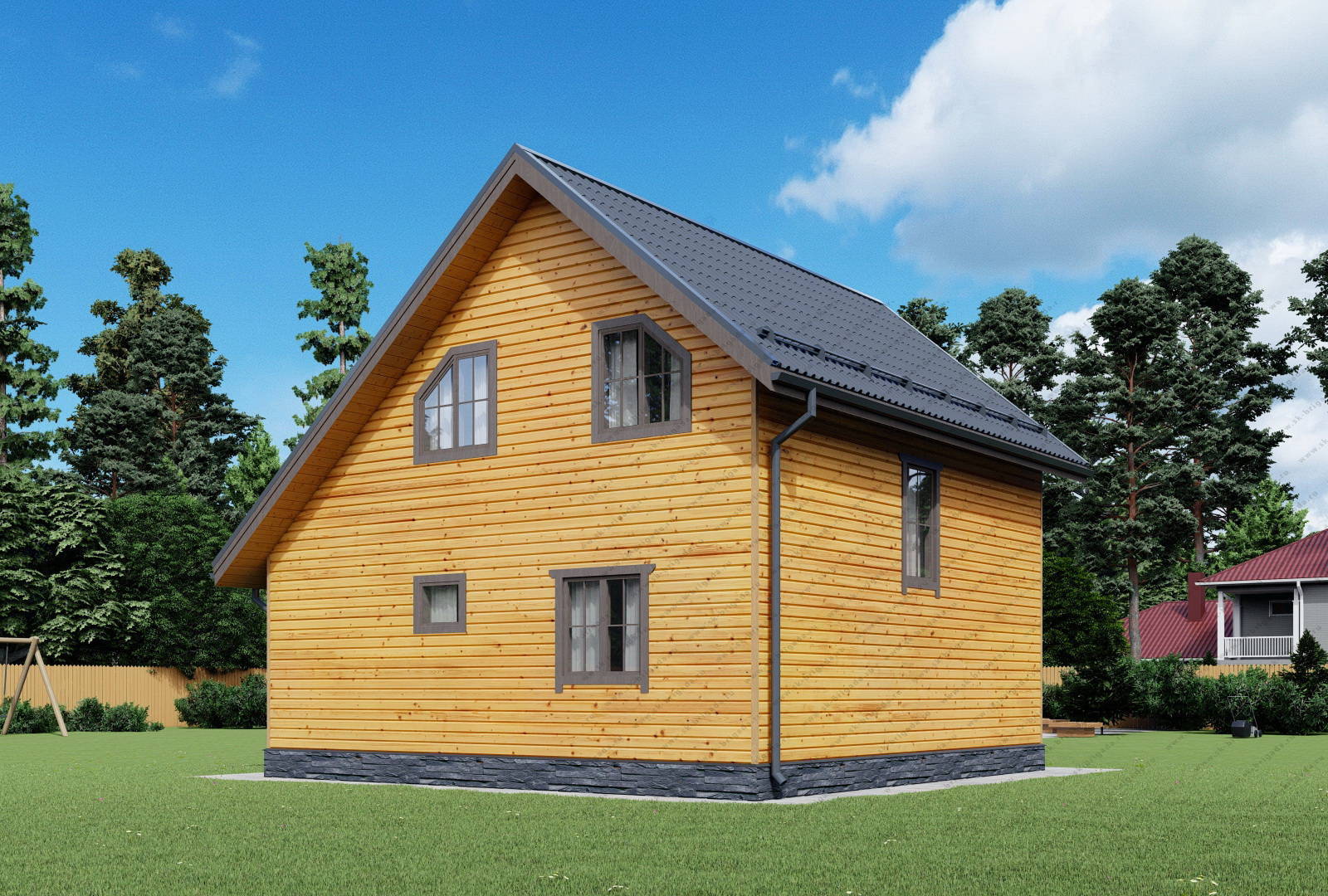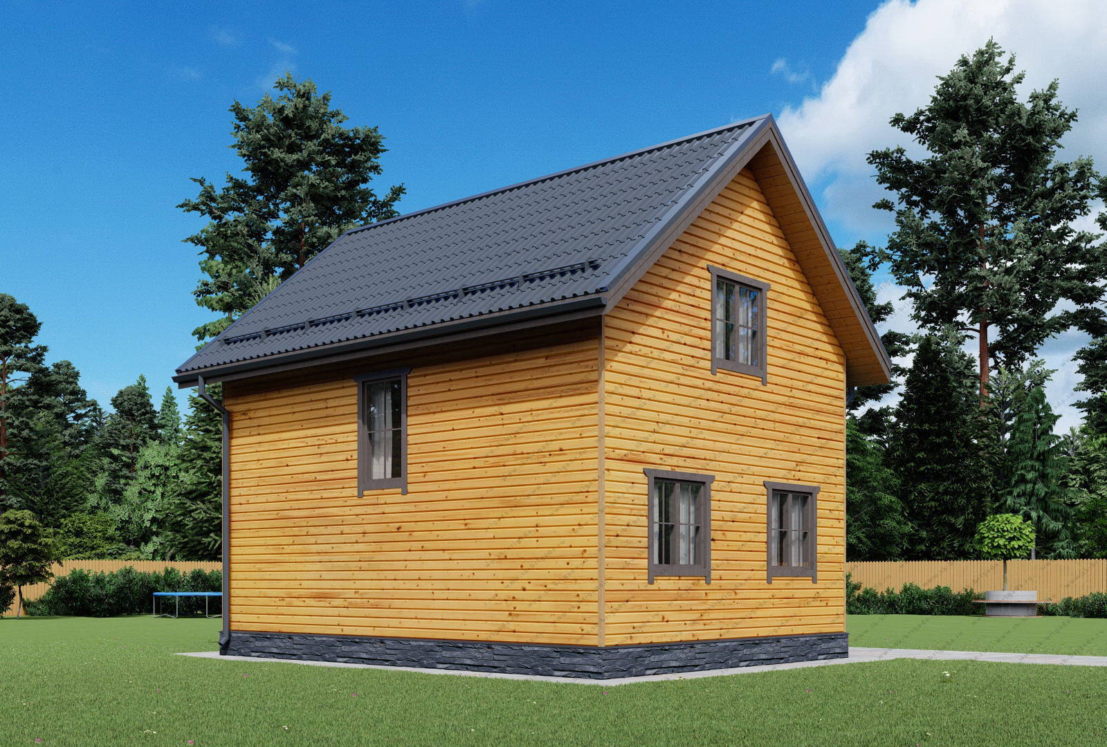 Дом 8х8 из бруса с отличной планировкой в стандартной комплектации имеет временную кровлю из рубероида на время усадки, при желании заказчика ее можно сразу заменить на металлочерепицу за 310000 рублей. В проекте БД-119 можно использовать практически любой кровельный материал (ондулин, ондувиллу, мягкую кровлю и т.п).