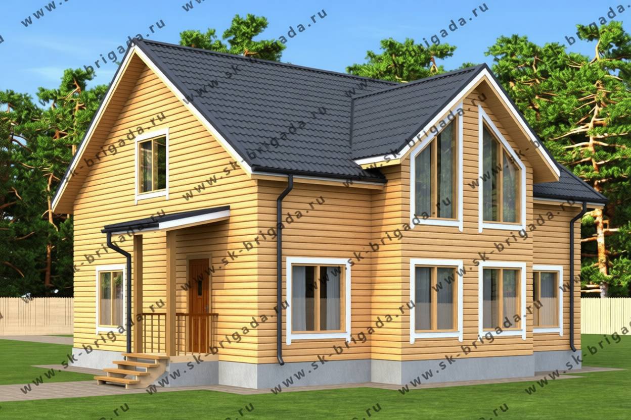 Предлагаем к строительству Дом с панорамными окнами и мансардой общей площадью всех помещений 179 кв.м и габаритными размерами самого сруба 10х10 за 2146000 рублей из обычного бруса сечением 150 на 150 мм или за 2422000 рублей из профилированного бруса сечением 140 на 140 мм. Из сухого профилированного бруса (камерной сушки) Дом с панорамными окнами и мансардой обойдется 2572000 рублей под ключ.