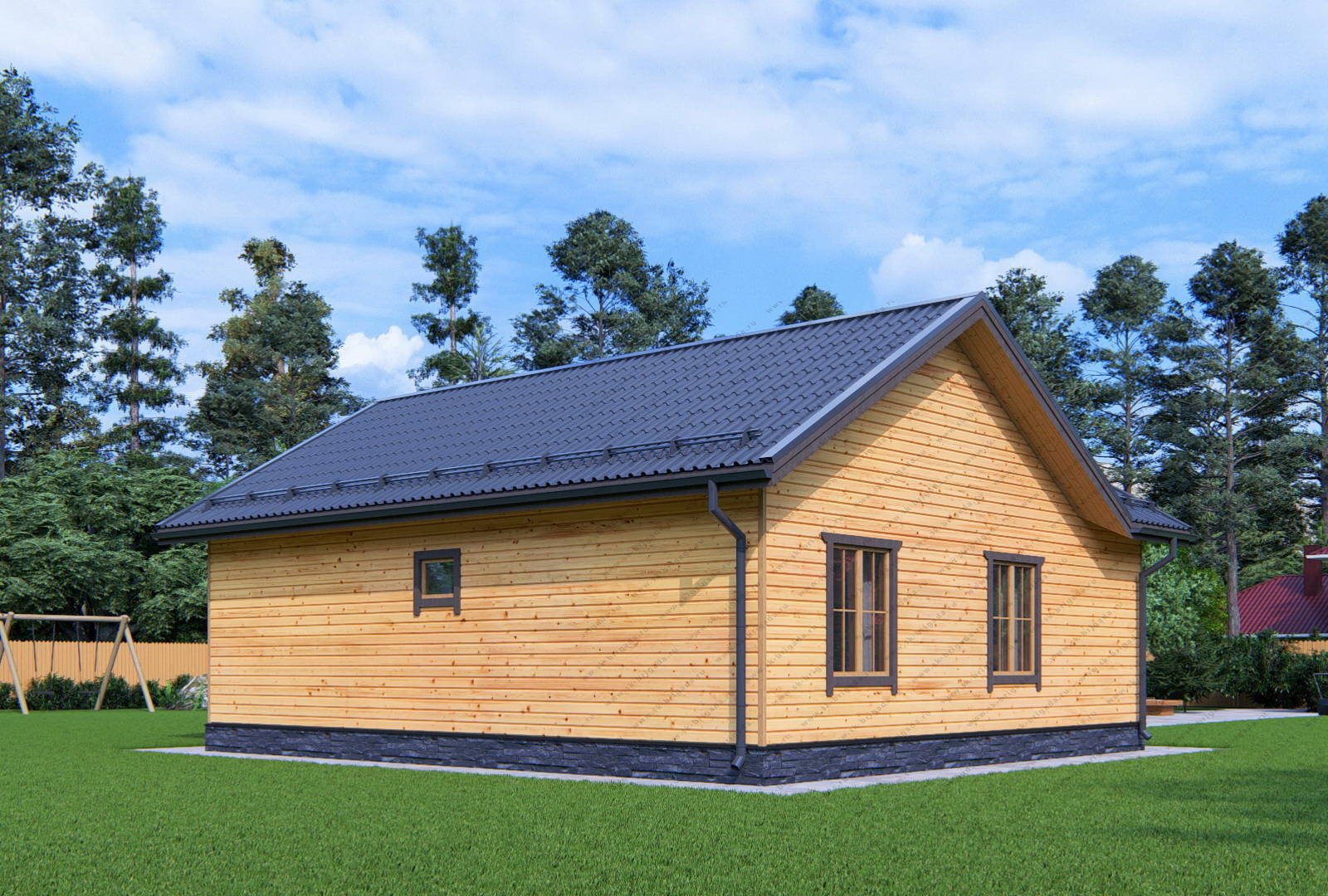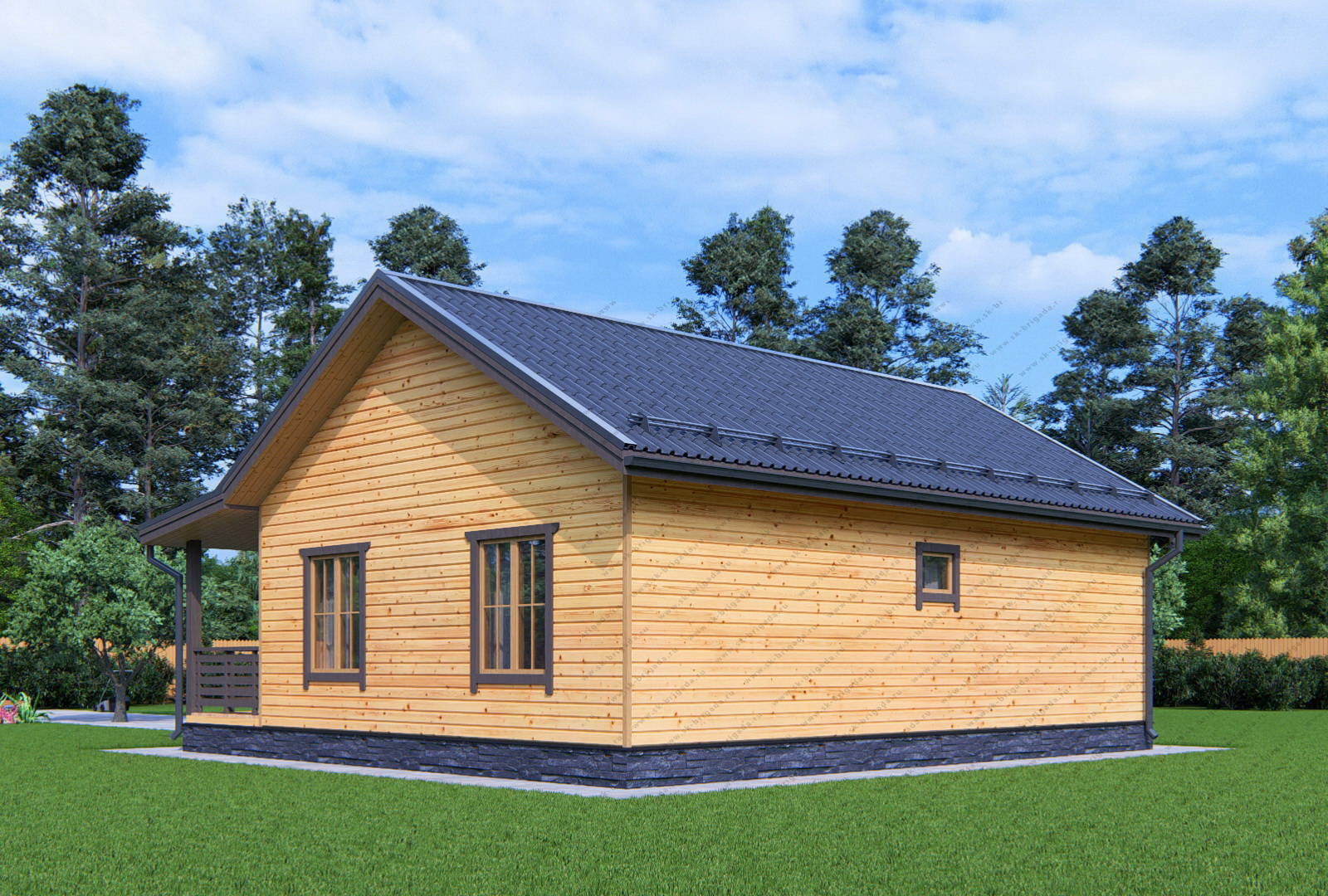 Одноэтажный дом 9 на 10 с террасой в стандартной комплектации имеет временную кровлю из рубероида на время усадки, при желании заказчика ее можно сразу заменить на металлочерепицу за 364000 рублей. В проекте БД-157 можно использовать практически любой кровельный материал (ондулин, ондувиллу, мягкую кровлю и т.п).