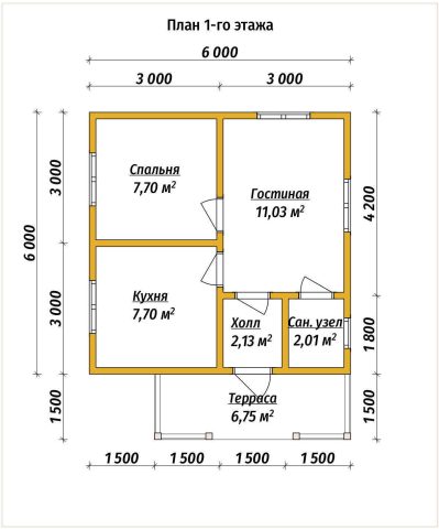 Одноэтажный дом из бруса 6х6 площадью 42 м2