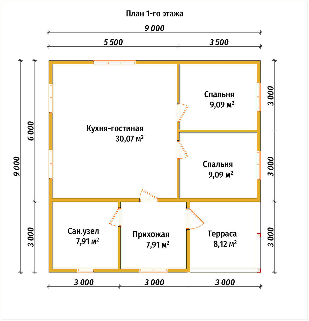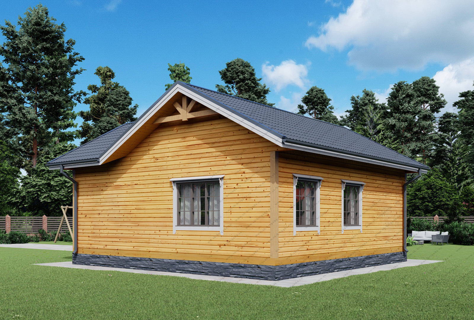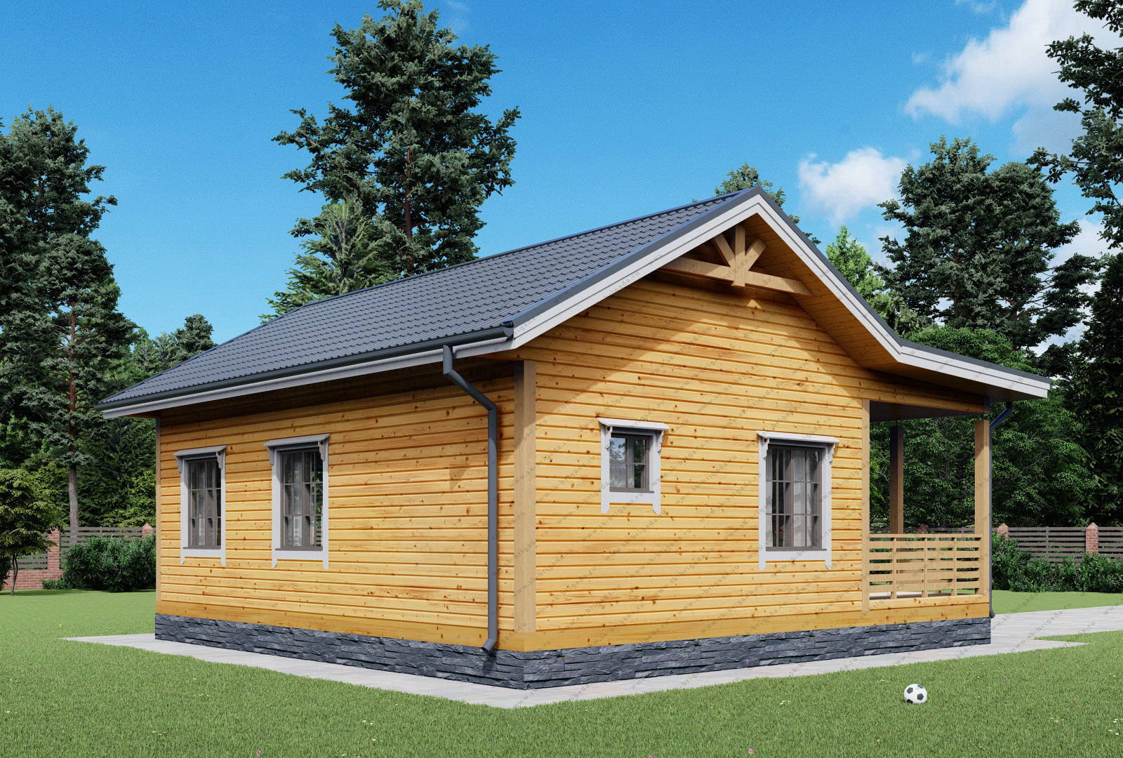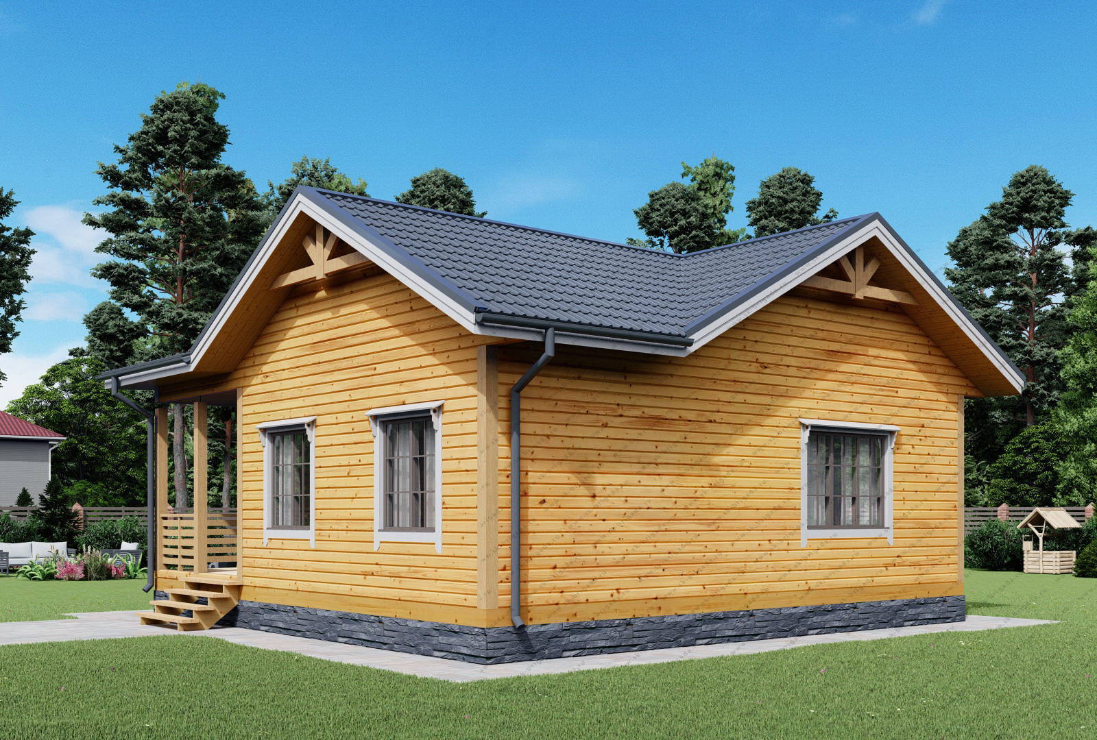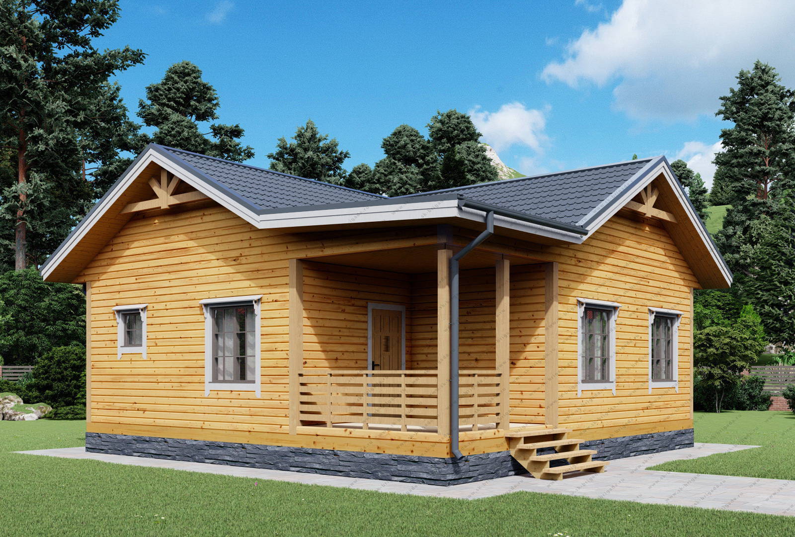 Одноэтажный дом из бруса 9 на 9 с террасой площадью 81 м2
