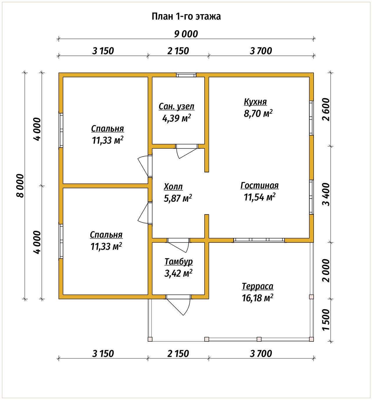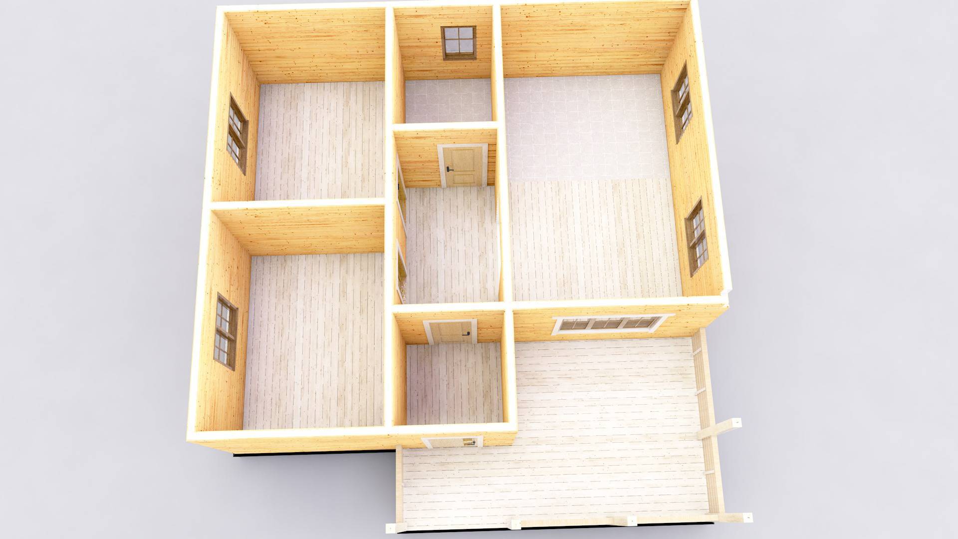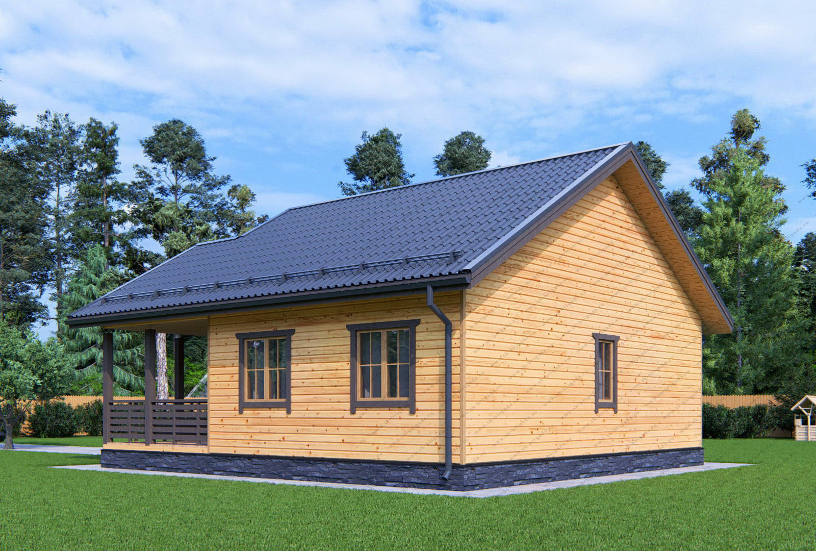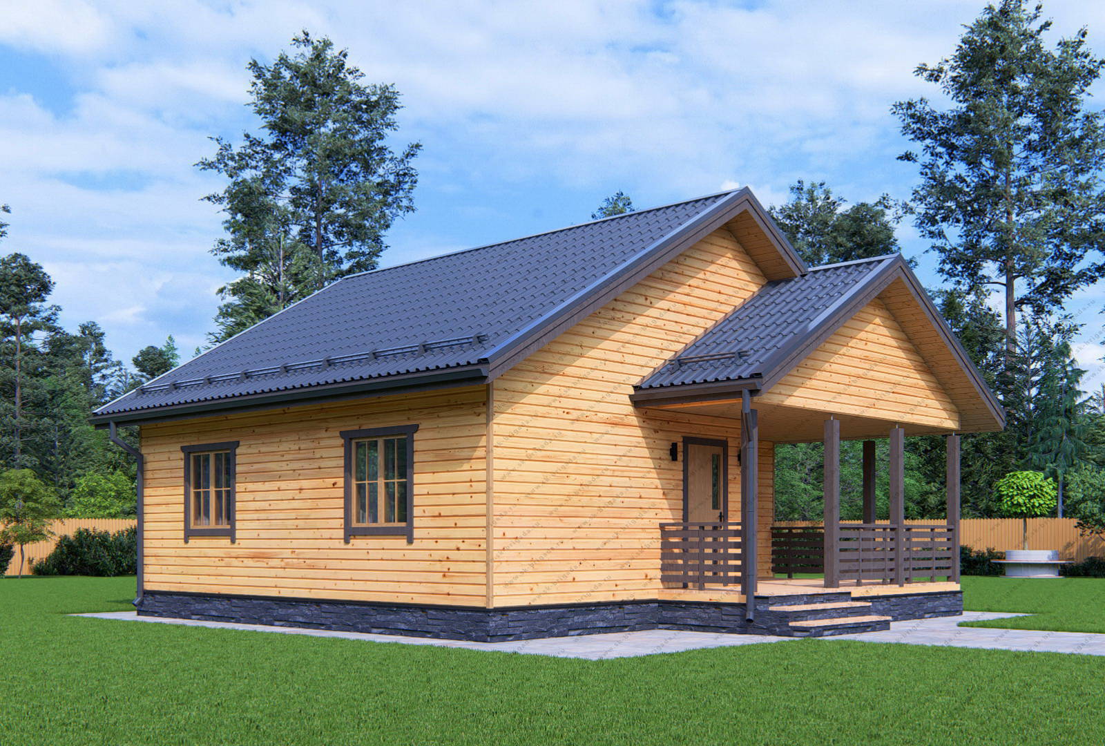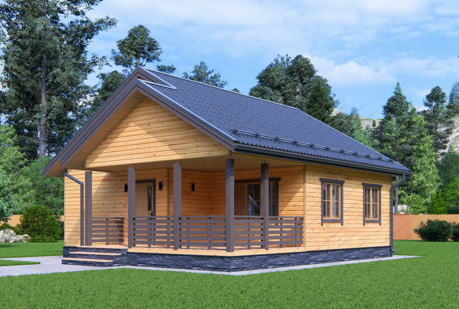 Одноэтажный дом из бруса 8 на 9 с террасой площадью 81 м2