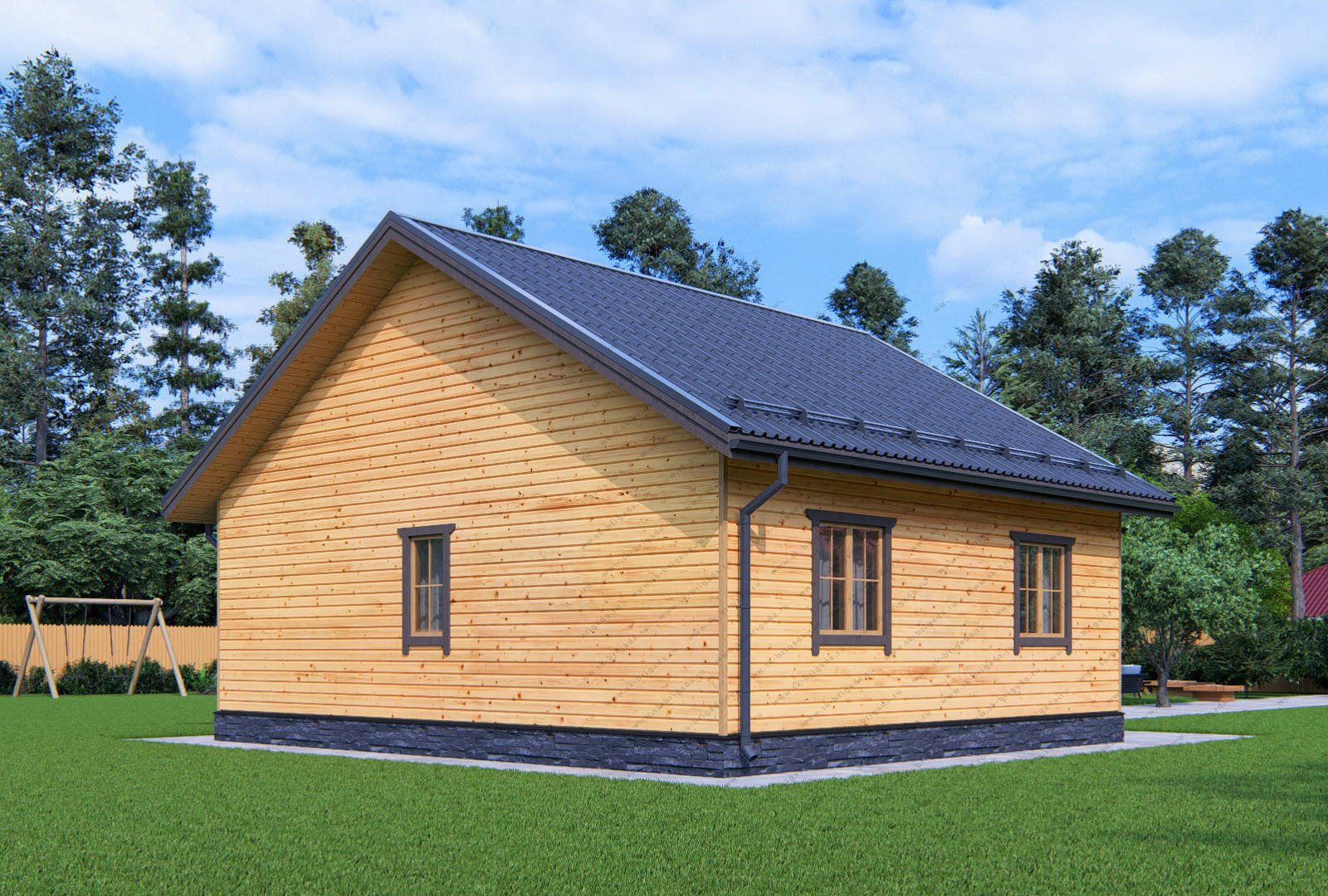 Одноэтажный дом из бруса 8 на 9 с террасой в стандартной комплектации имеет временную кровлю из рубероида на время усадки, при желании заказчика ее можно сразу заменить на металлочерепицу за 351000 рублей. В проекте БД-56 можно использовать практически любой кровельный материал (ондулин, ондувиллу, мягкую кровлю и т.п).