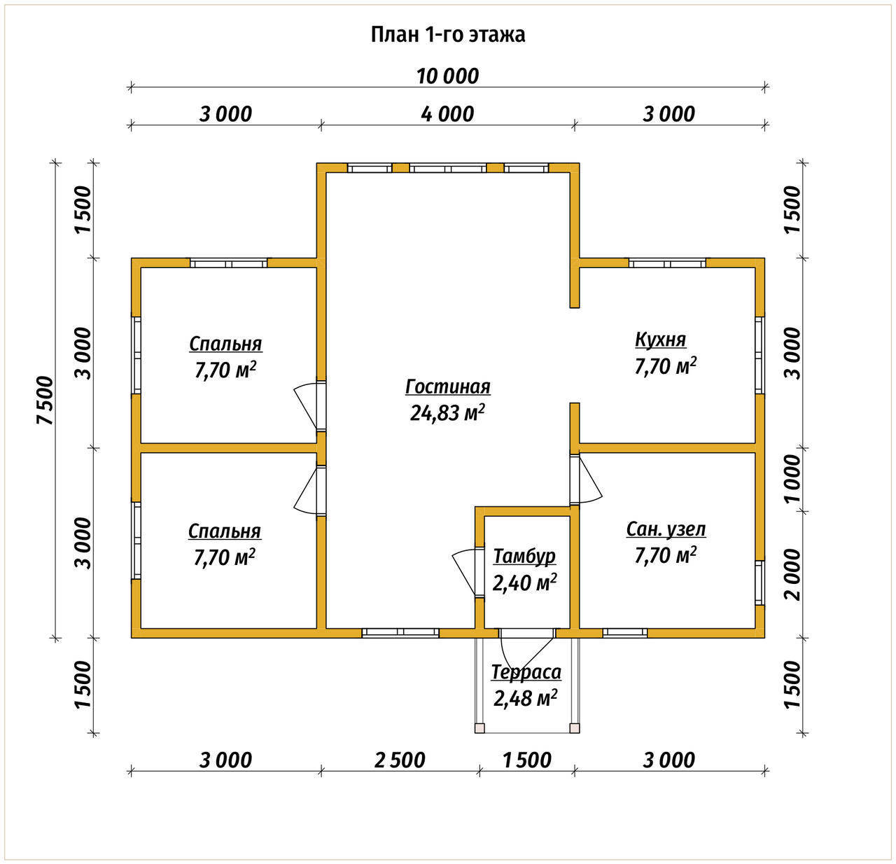 Предлагаем к строительству Одноэтажный дом 7х10 из бруса общей площадью всех помещений 68 кв.м и габаритными размерами самого сруба 7,5х10 за 1334000 рублей из обычного бруса сечением 150 на 150 мм или за 1552000 рублей из профилированного бруса сечением 140 на 140 мм. Из сухого профилированного бруса (камерной сушки) Одноэтажный дом 7х10 из бруса обойдется 1625000 рублей под ключ.