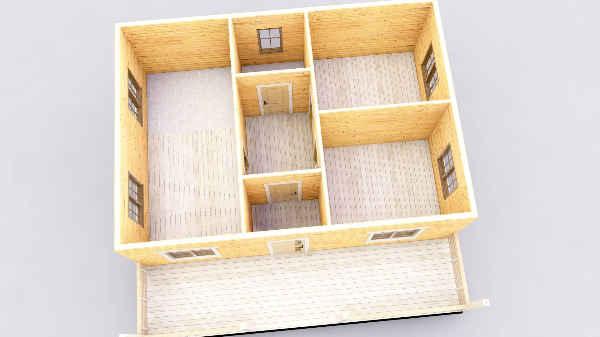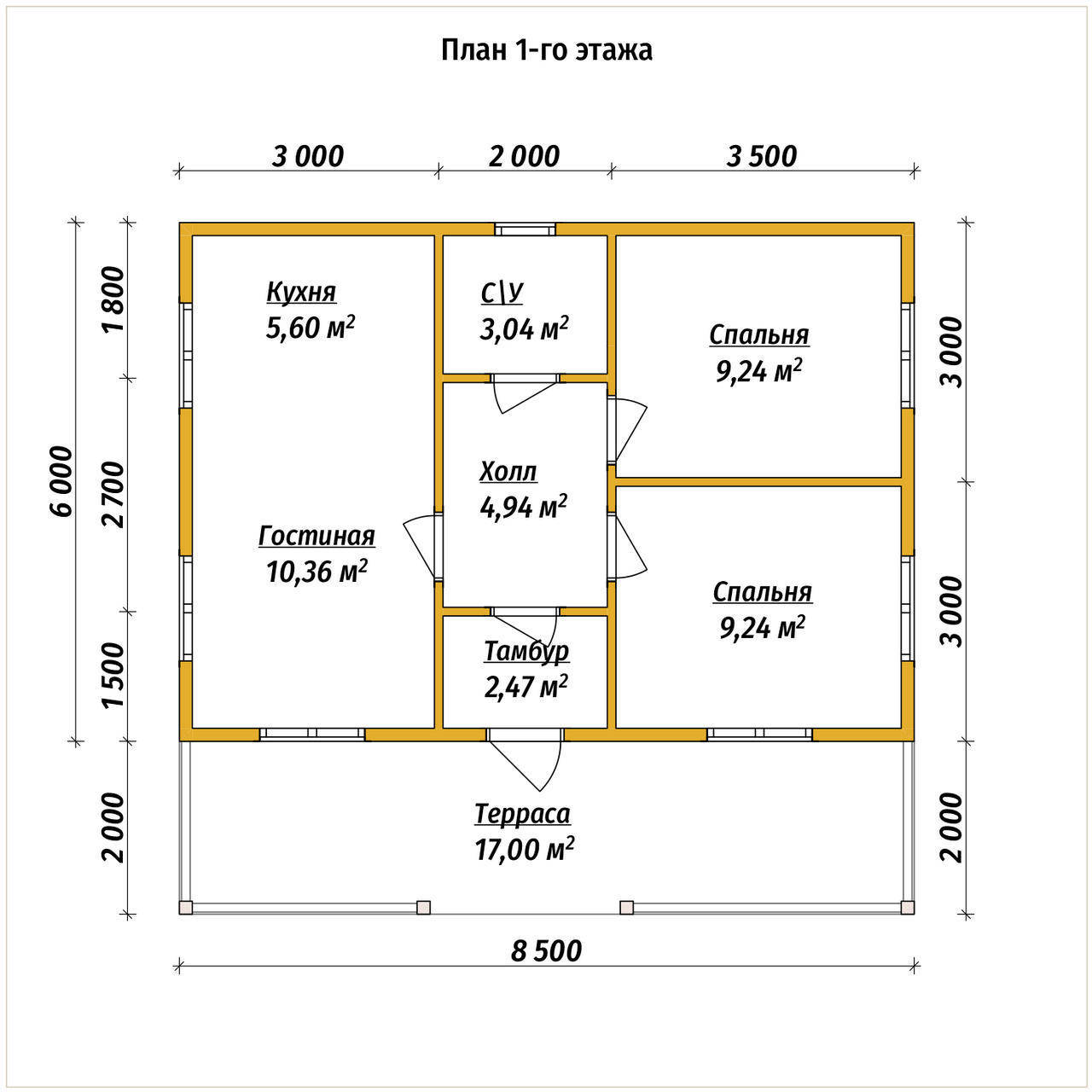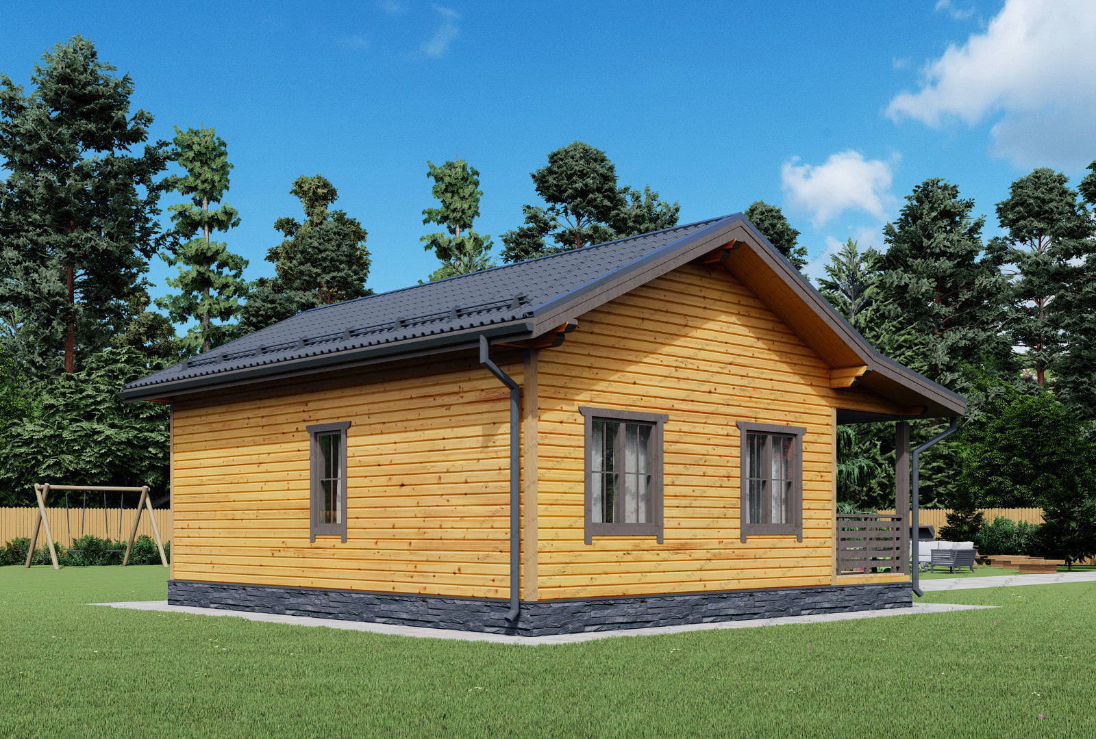 Одноэтажный дом из бруса 6 на 8,5 с террасой площадью 68 м2