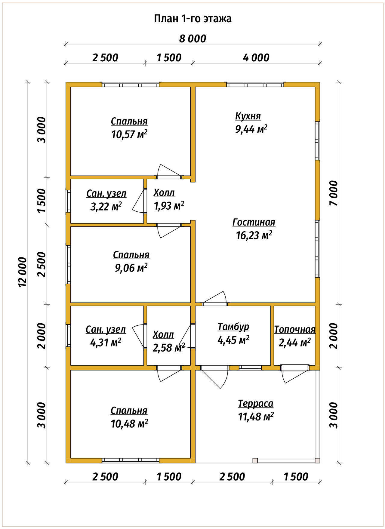 Одноэтажный дом из бруса 8х12 площадью 96 м2