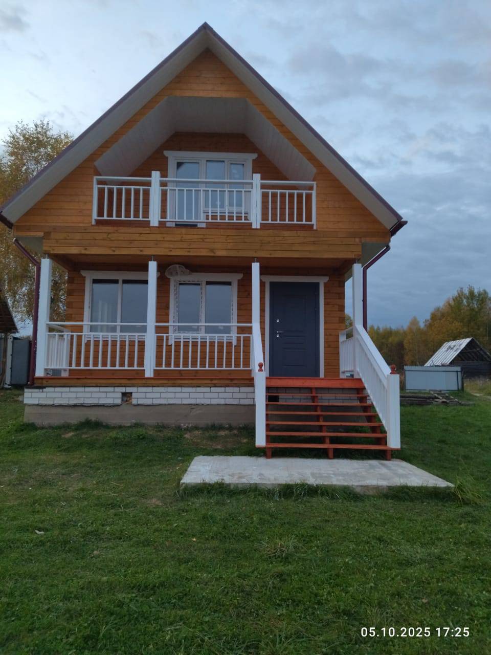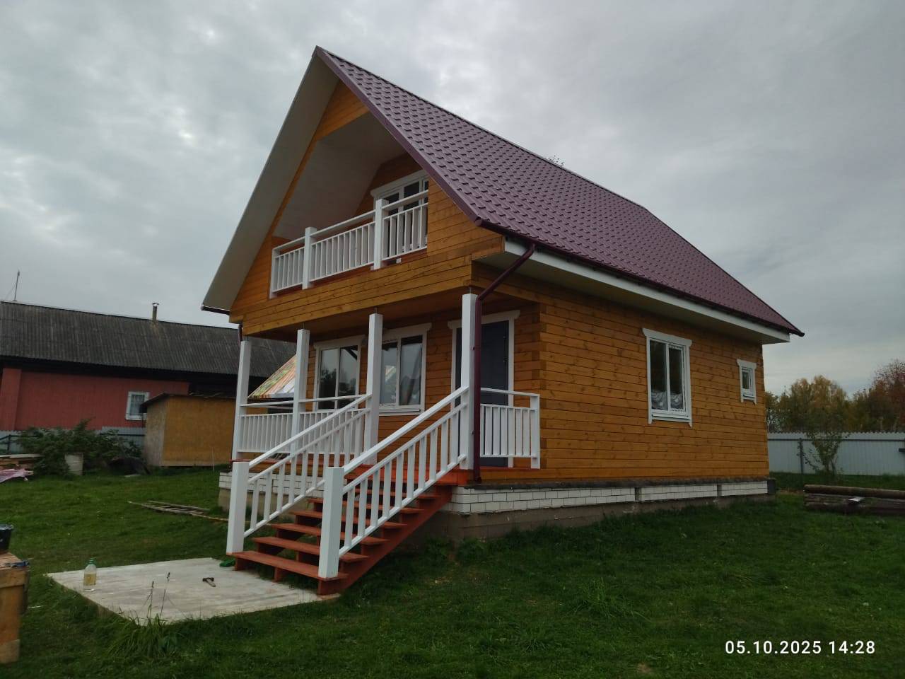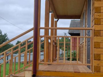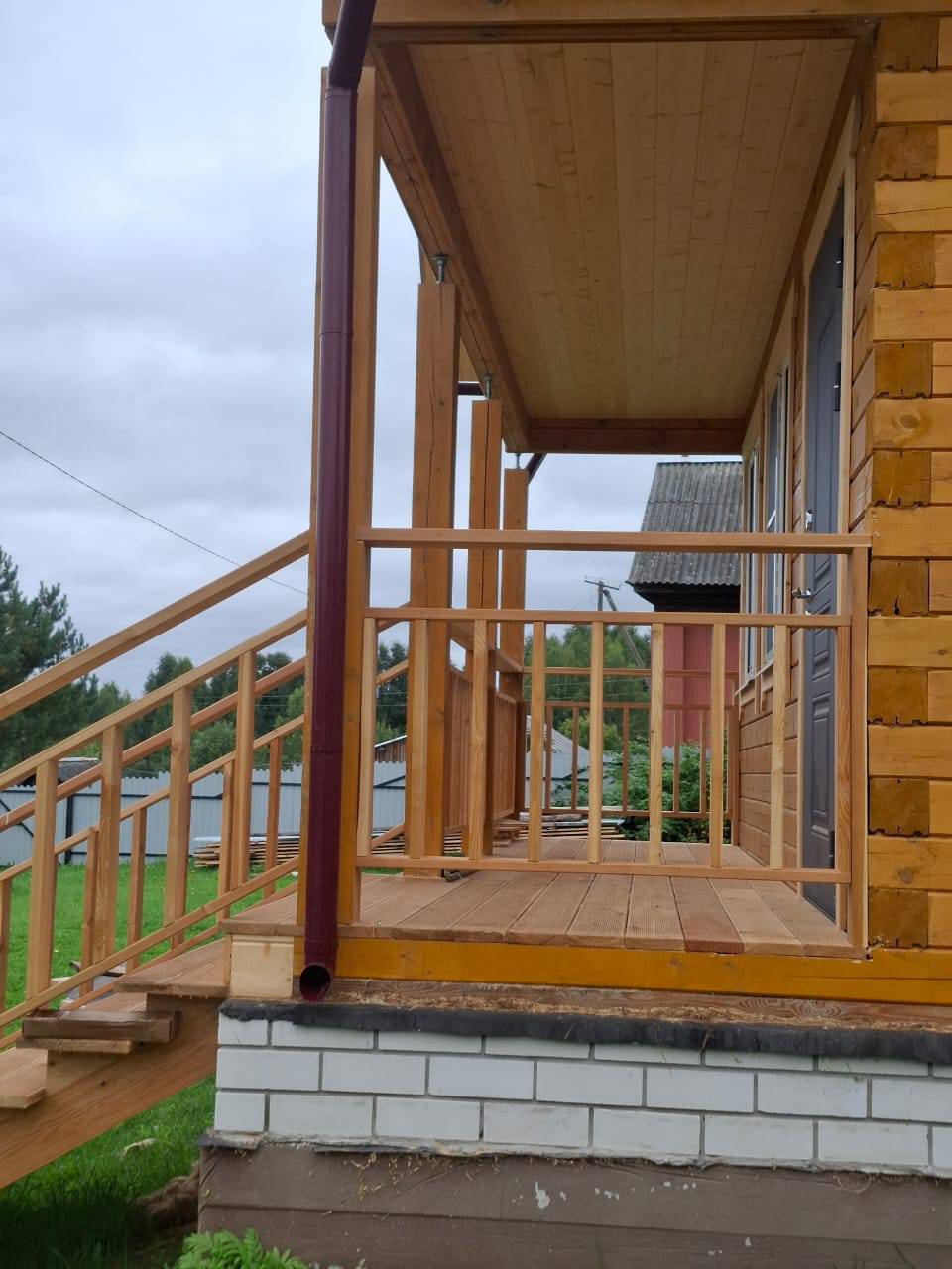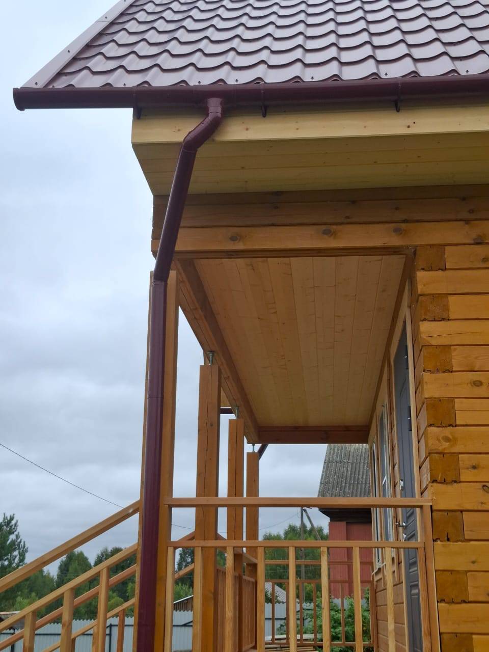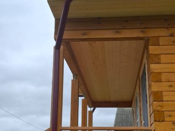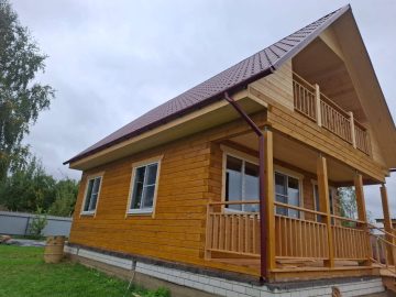 После усадки были сделаны подшив, терраса, балкон и крыльцо и покрашен. Установлены окна и водосточная система.
