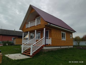 Фото отчет строительства дома из бруса 6 на 9 по БД-197 (Деревянный дом с балконом и террасой) под усадку на готовом ленточном фундаменте и покрытием крыши металлочерепицей. Наружные стены дома выполнены из профилированного бруса 145х145 мм, а внутренние из 95х145 мм.