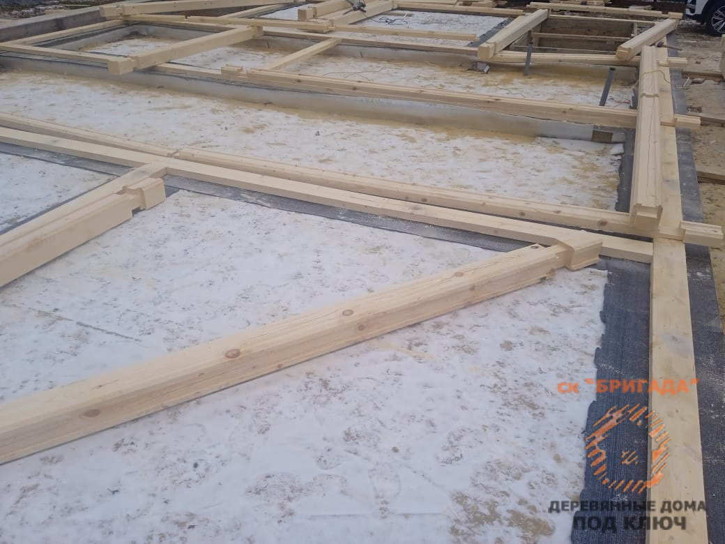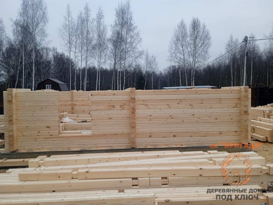 Сруб дома в чашу размером 9,4 на 12 метров выполнен из профилированного бруса сечением 145х145 мм под усадку на ленточном фундаменте по индивидуальному проекту заказчика.