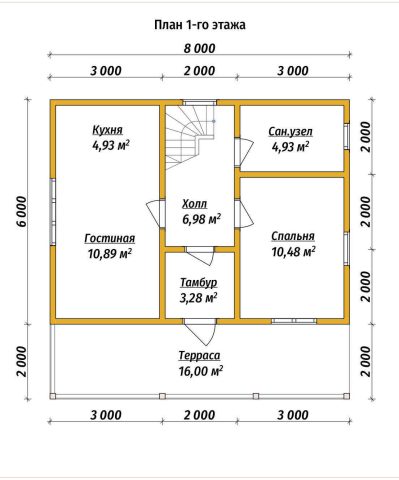 Предлагаем построить Каркасный дачный дом 6 на 8 с террасой площадью 99 кв.м и габаритными размерами самого каркаса 6х8 за 3730000 рублей с толщиной наружной стены 100 мм, за 3925000 рублей вы получите стену 150 мм, а стена с утеплением в 200 мм обойдется в 4130000 рублей.