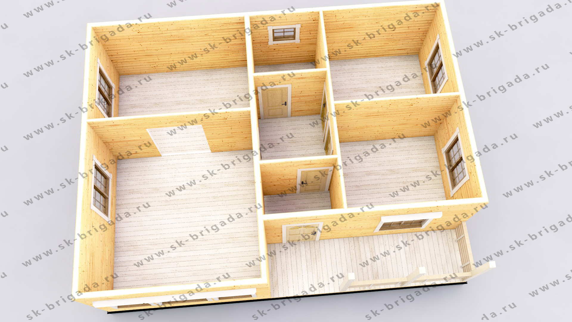 - Пол на террасе/крыльце (при наличии) – строганная доска 45х140 мм камерной сушки. Подшив стен и потолка на террасах – имитация бруса камерной сушки, сорт АВ.