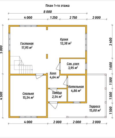 Предлагаем построить Каркасный дом 8х9 с террасой площадью 140 кв.м и габаритными размерами самого каркаса 8х9,5 за 5430000 рублей с толщиной наружной стены 100 мм, за 5720000 рублей вы получите стену 150 мм, а стена с утеплением в 200 мм обойдется в 6015000 рублей.
