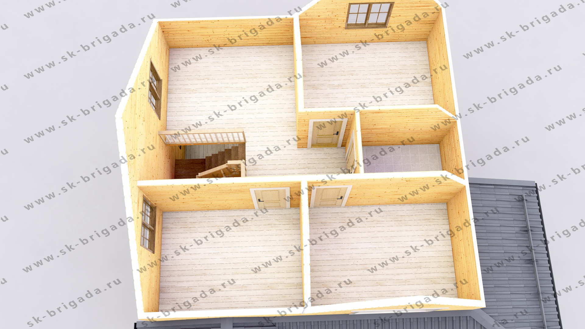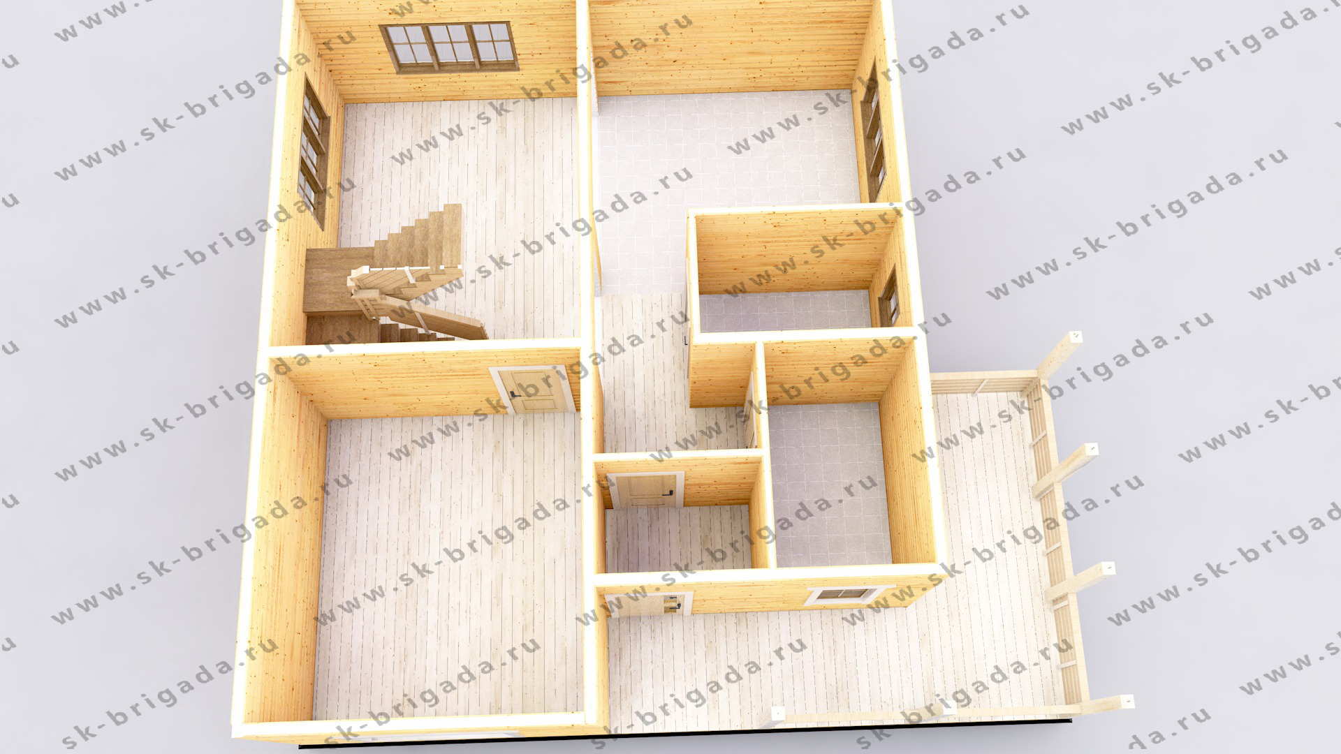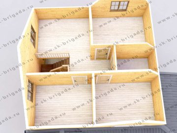 - Пол на террасе/крыльце (при наличии) – строганная доска 45х140 мм камерной сушки. Подшив стен и потолка на террасах – имитация бруса камерной сушки, сорт АВ.