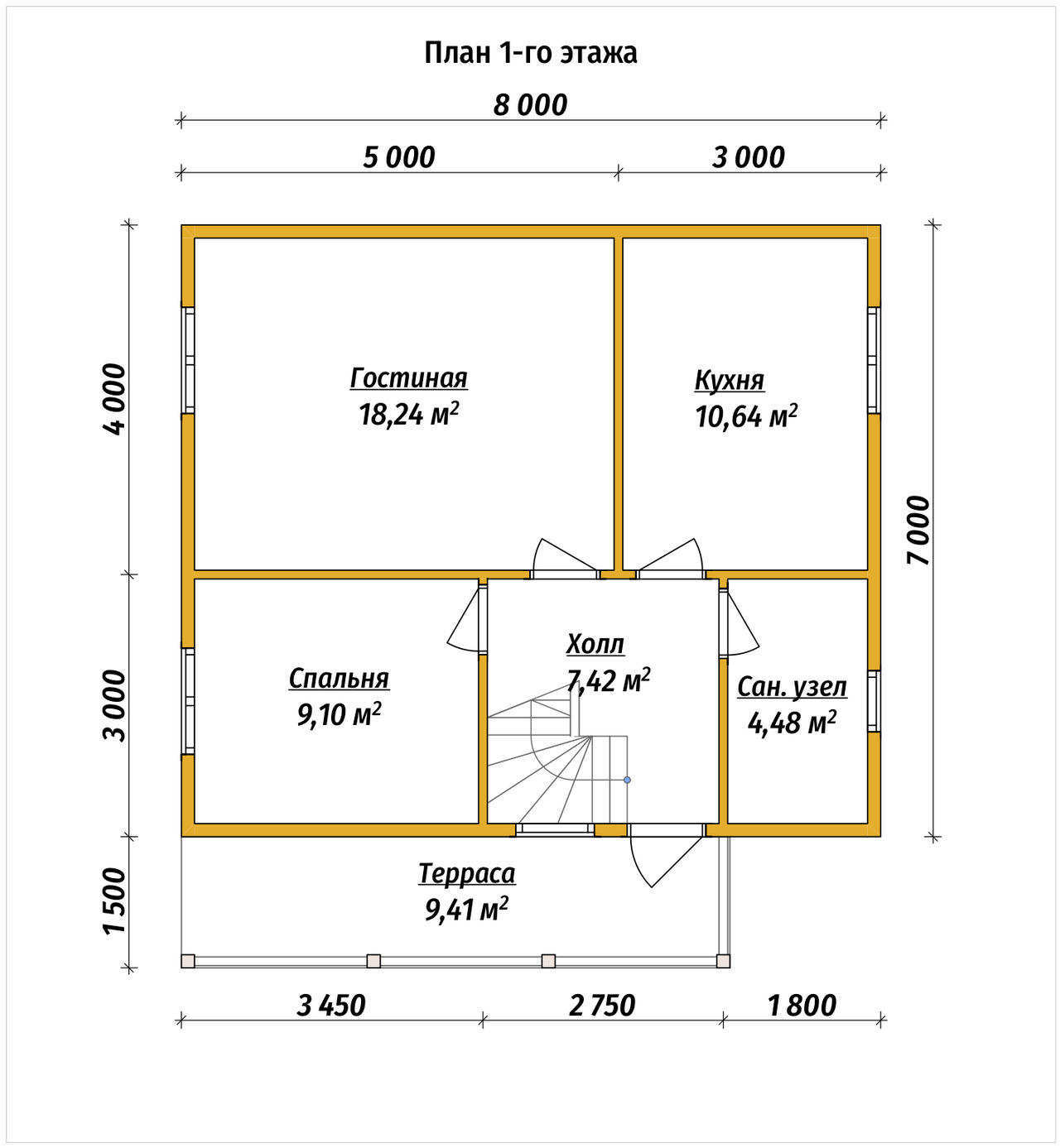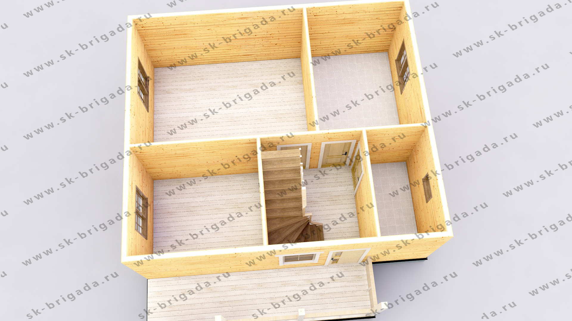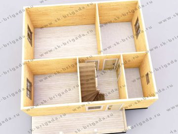 - Пол на террасе/крыльце (при наличии) – строганная доска 45х140 мм камерной сушки. Подшив стен и потолка на террасах – имитация бруса камерной сушки, сорт АВ.